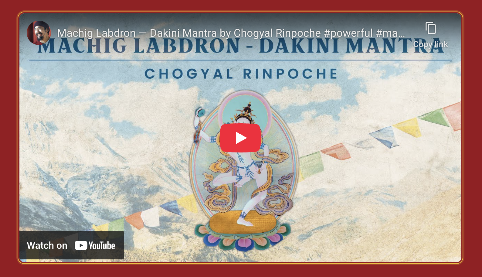 Chogyal recorded the dakini mantra—Om a hung bam guru ha ri ni sa siddhi hung—in recognition of the feminine in Buddhism. It begins with the sound of a trumpet to cut through our attachments before listening and chanting if we feel moved to.